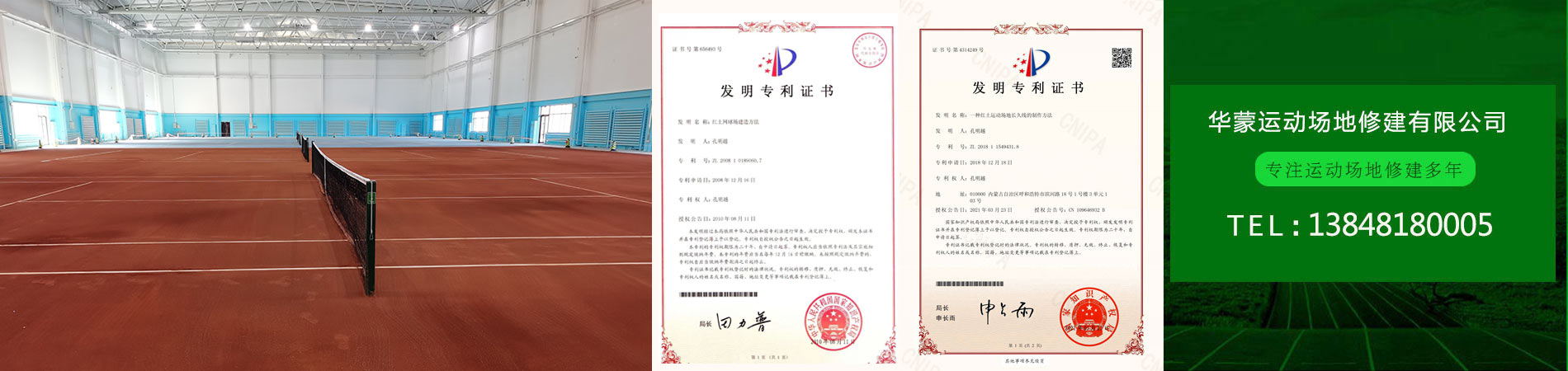 "紅土網球場地建造方法”獲得了實用專利技術證書,解決了紅土場地長畫線及畫線難的問題;產品綠色環?!ㄟ^權威認證機構無毒環保檢驗。